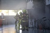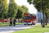 Bereits bei der ersten Erkundung stellte sich heraus, dass im Bereich der Montagehalle ein Brand ausgebrochen war. Aufgrund der Lage erfolgte umgehend die Auslösung der Alarmstufe 2 mit dem Stichwort "Brand Industrie".