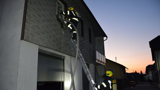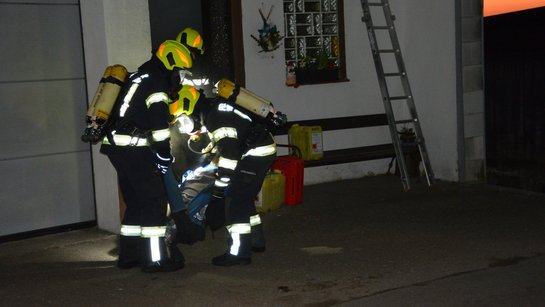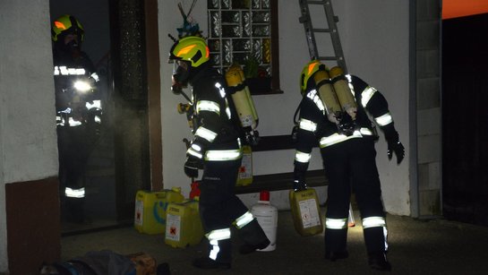 Zwei Atemschutztrupps stellten sich realistischen Einsatzszenarien: Einstieg über eine Leiter ins 1. Obergeschoss, Personensuche, Brandbekämpfung und das Sichern gefährlicher Stoffe.