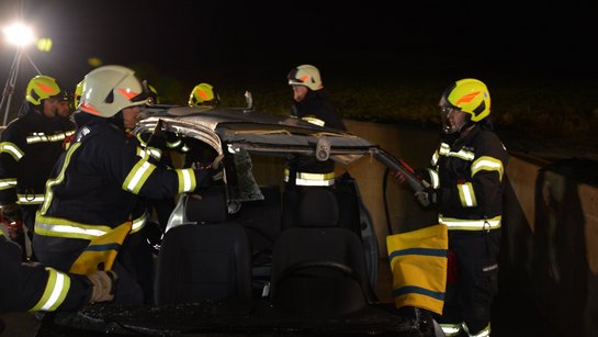 In der letzten Einheit der THL-Ausbildung wurden alle zuvor erlernten Inhalte kombiniert und praktisch umgesetzt. Schwerpunkte waren Schnitttechniken mit der Säbelsäge, Patientenrettung aus einem PKW, das Schaffen einer großen Seitenöffnung, Dachentfernung und die Fahrzeugstabilisierung.