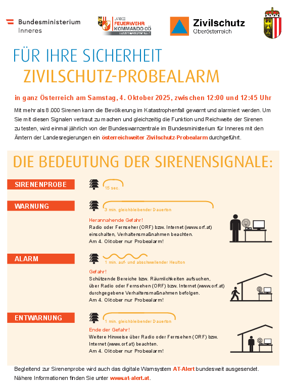 Am ersten Samstag im Oktober, 4. Oktober 2025, wird wieder ein bundesweiter Zivilschutz-Probealarm durchgefĂŒhrt. Zwischen 12:00 und 12:45 Uhr werden nach dem Signal âSirenenprobeâ die drei Zivilschutzsignale âWarnungâ, âAlarmâ und âEntwarnungâ in ganz Ăsterreich ausgestrahlt. Der Probealarm dient einerseits zur ĂberprĂŒfung der technischen Einrichtungen des Warn- und Alarmsystems, andererseits soll die Bevölkerung mit diesen Signalen und ihrer Bedeutung vertraut gemacht werden. In den Medien wird wĂ€hrend der Proben stĂ€ndig informiert.